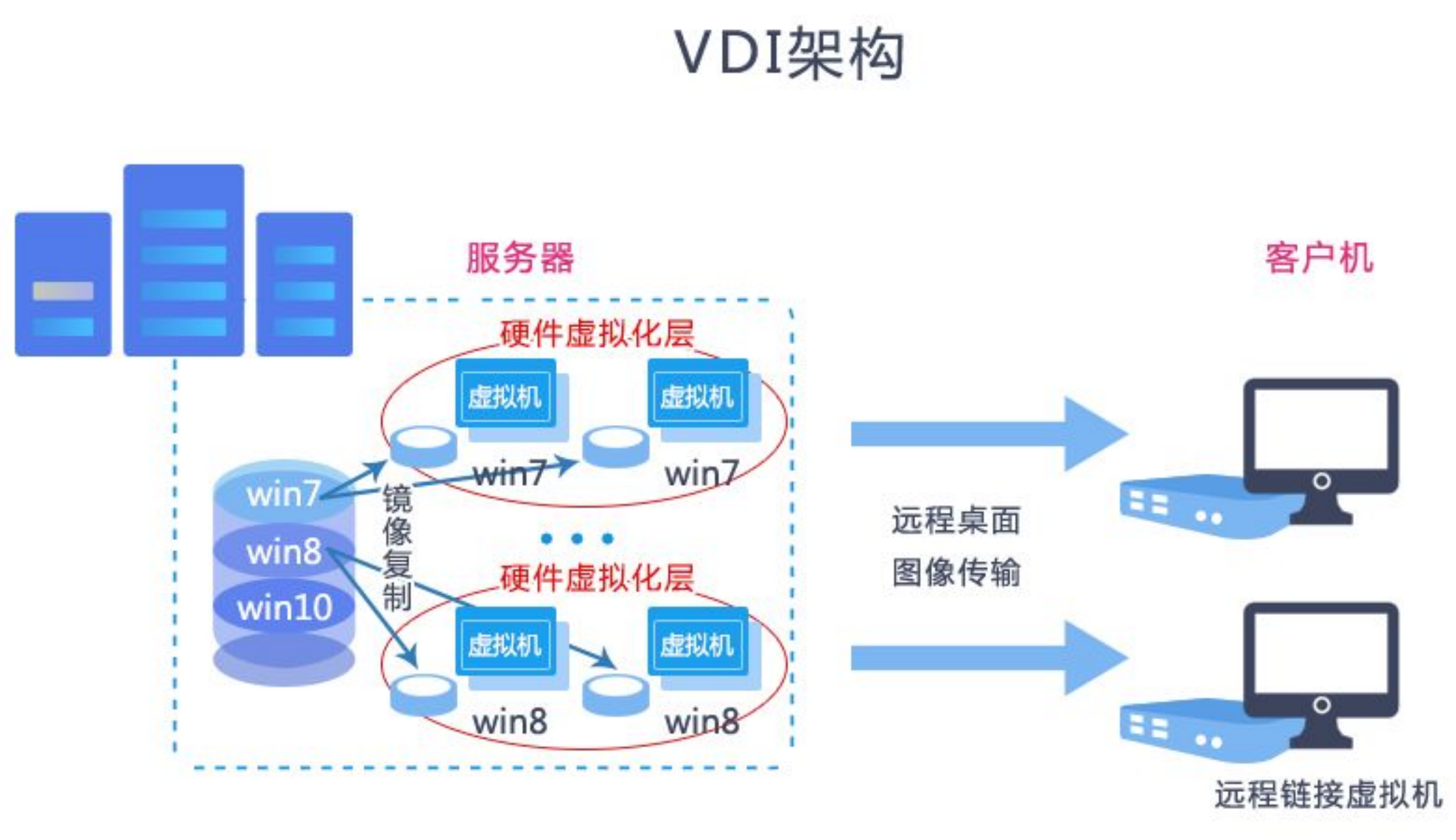 VDI是采用集中计算、集中存储的虚拟桌面基础架构。其架构是所有计算资源都基于服务器,所有运算都在服务器上,前端只需要瘦终端通过网络连接服务器上虚拟桌面在显示器上显示,每一个用户是一个独立的操作系统,在逻辑上完全隔开。