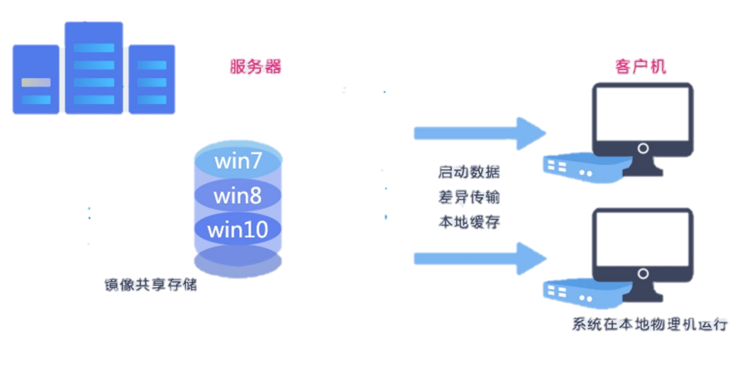 VOI在IDV等传统云桌面架构基础上进行了改进,也采用“集中存储、分布运算”的构架,与IDV不同之处在于抛弃了硬件虚拟化层,而采用类似无盘工作站的方式启动客户端系统,让桌面完全运行在本地物理机只上,支持离线运行,支持桌面系统集中安全管理,但是性能有了很大的改善,桌面性能完全保持传统PC的体验,不存在兼容性问题,是新一代云桌面的代表。