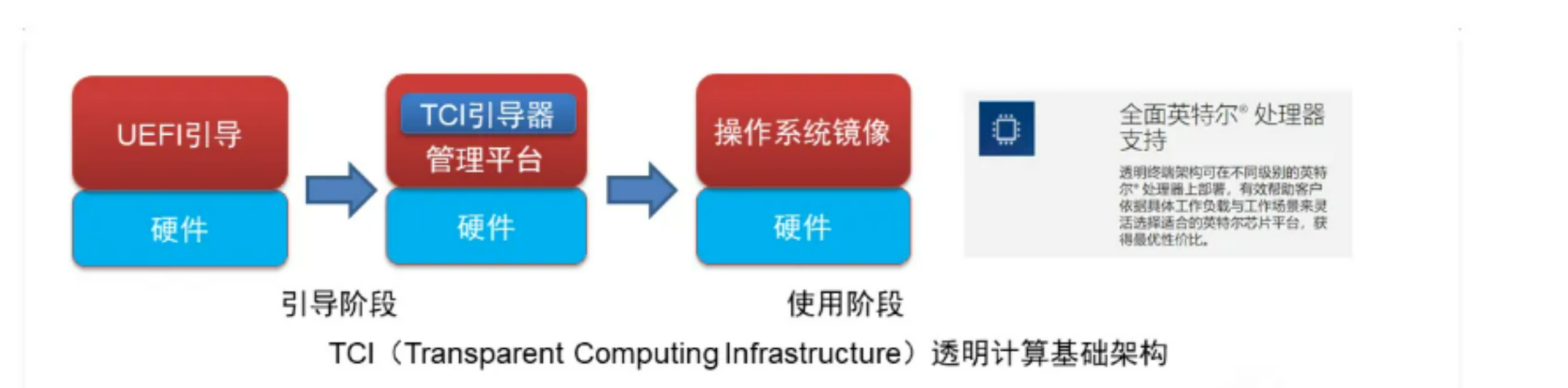 相比IDV,TCI采用的是非虚拟化的架构,在引导阶段,通过基于UEFI的TCI引导器进行引导,在TCI引导器中,用户可进行账号登录、镜像选择等操作;而当用户选择了操作系统镜像之后,引导器则退出,由操作系统直接对接底层硬件。在保留了“镜像集中制作,远程下发/更新”特性的同时,TCI技术去掉了虚拟化层,从而让用户可100%获得硬件性能,同时对于Intel架构的PC,其兼容性较好,可使用于大部分基于Intel架构的计算机。